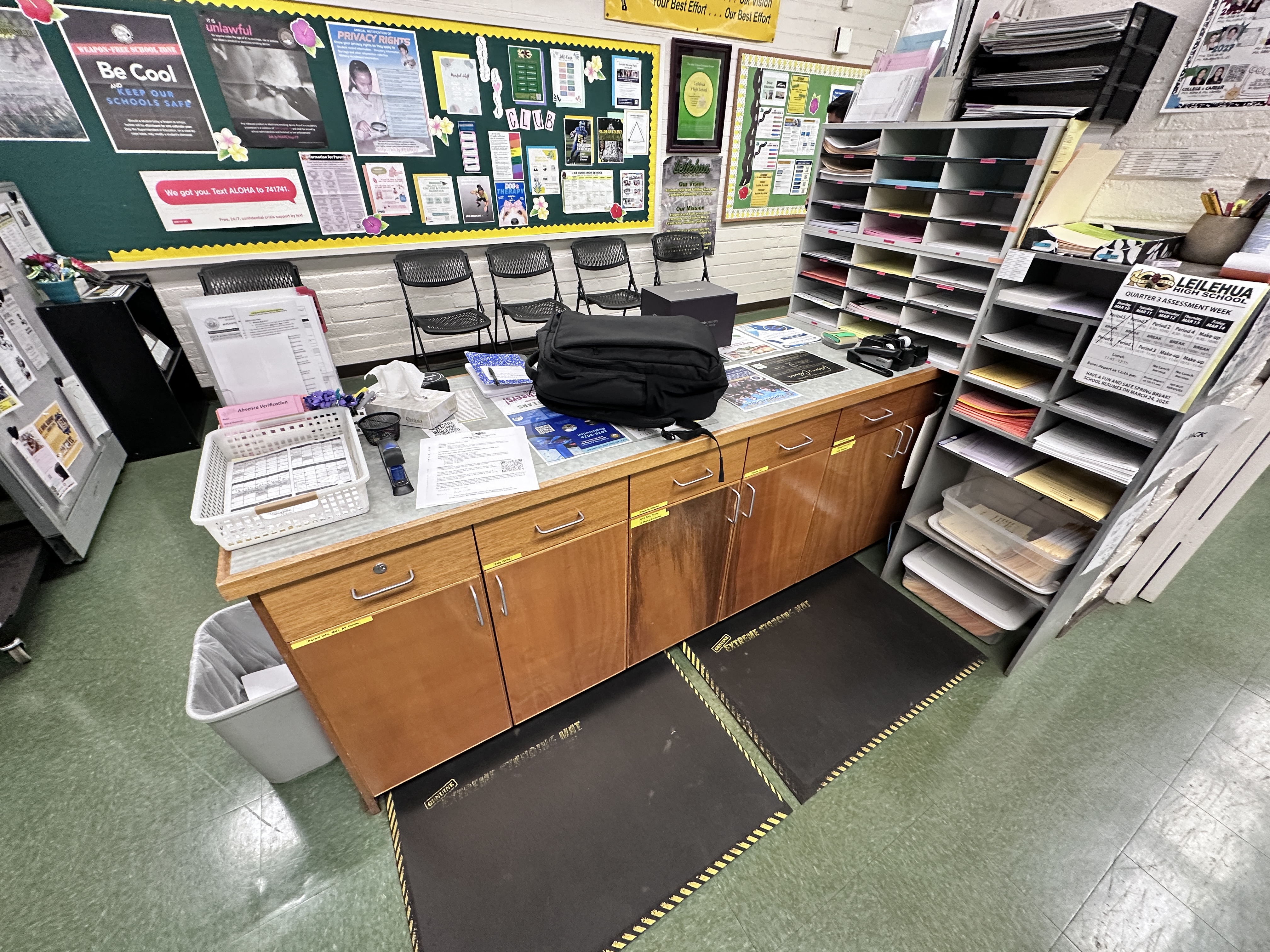Much needed upgrade for check in counter at the school's administration office. Plenty of different storage types, drawers, doors, and open shelving for documents. Drawer lock added for security. Fluted wall panels finish the guest facing side.