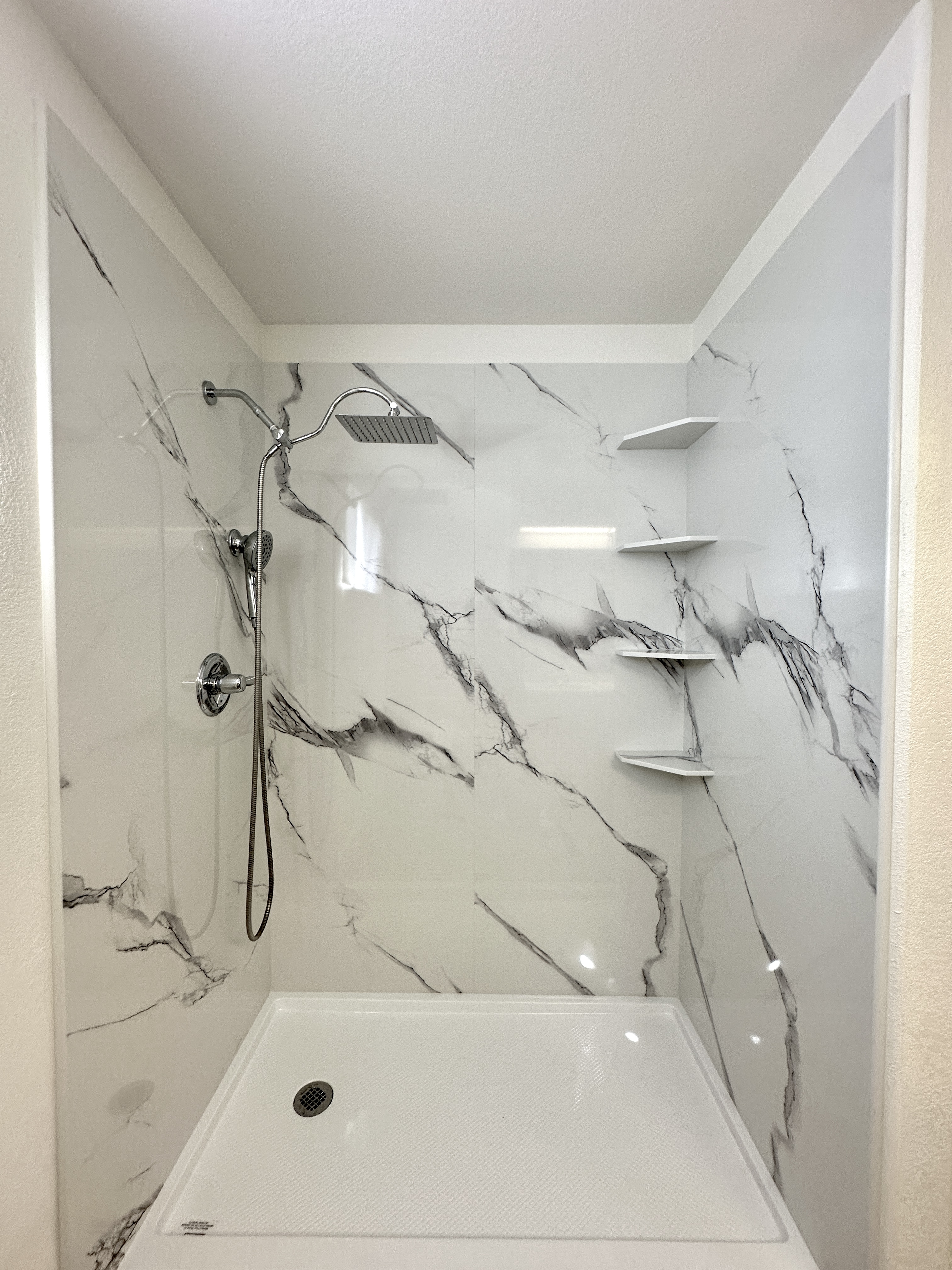 36" W x 107" H Engineered Stone Shower Panel. Durable 5/8" thickness, non-porous and easy to clean surface. Say goodbye to cleaning grout! Available locally now.