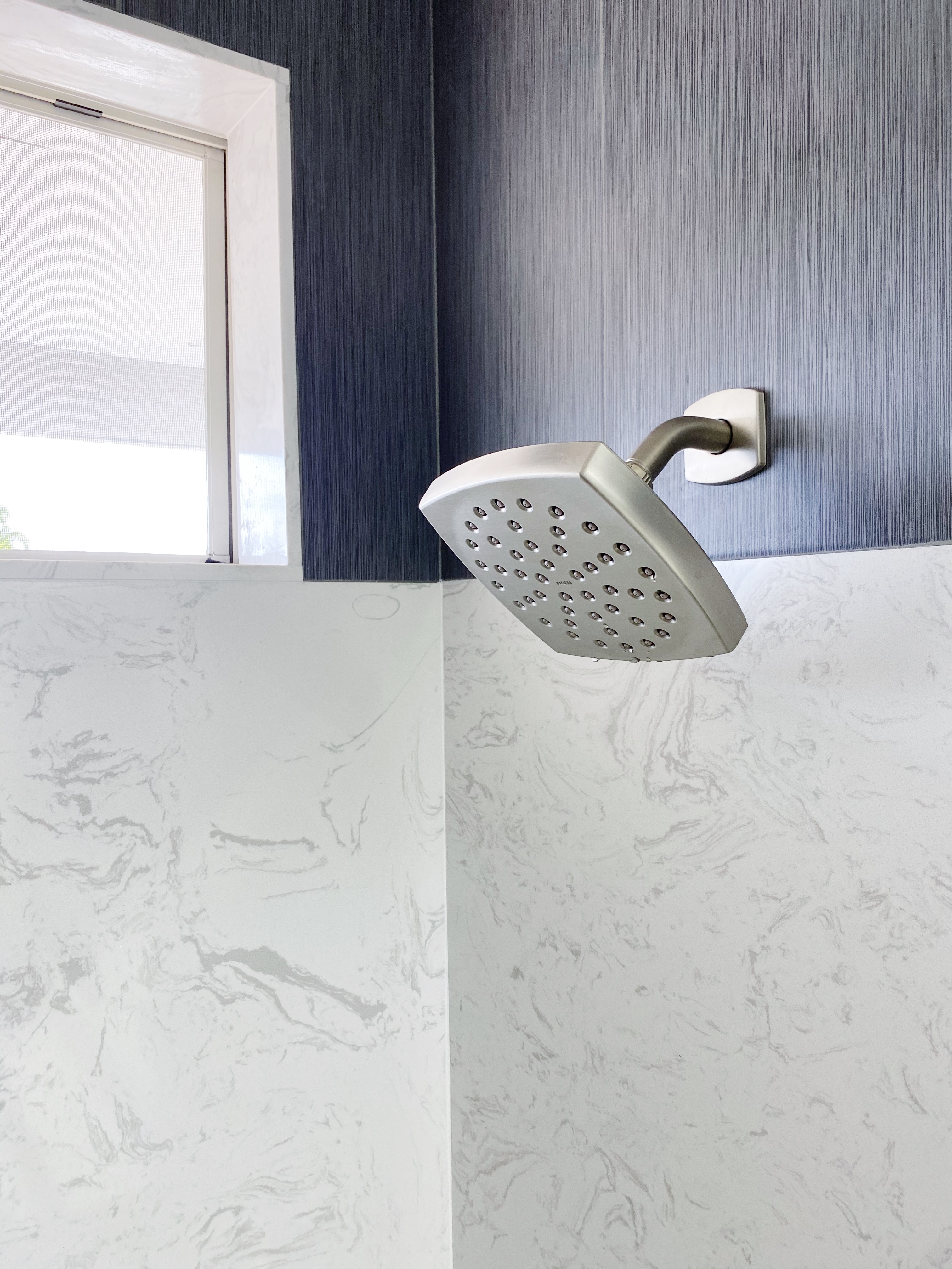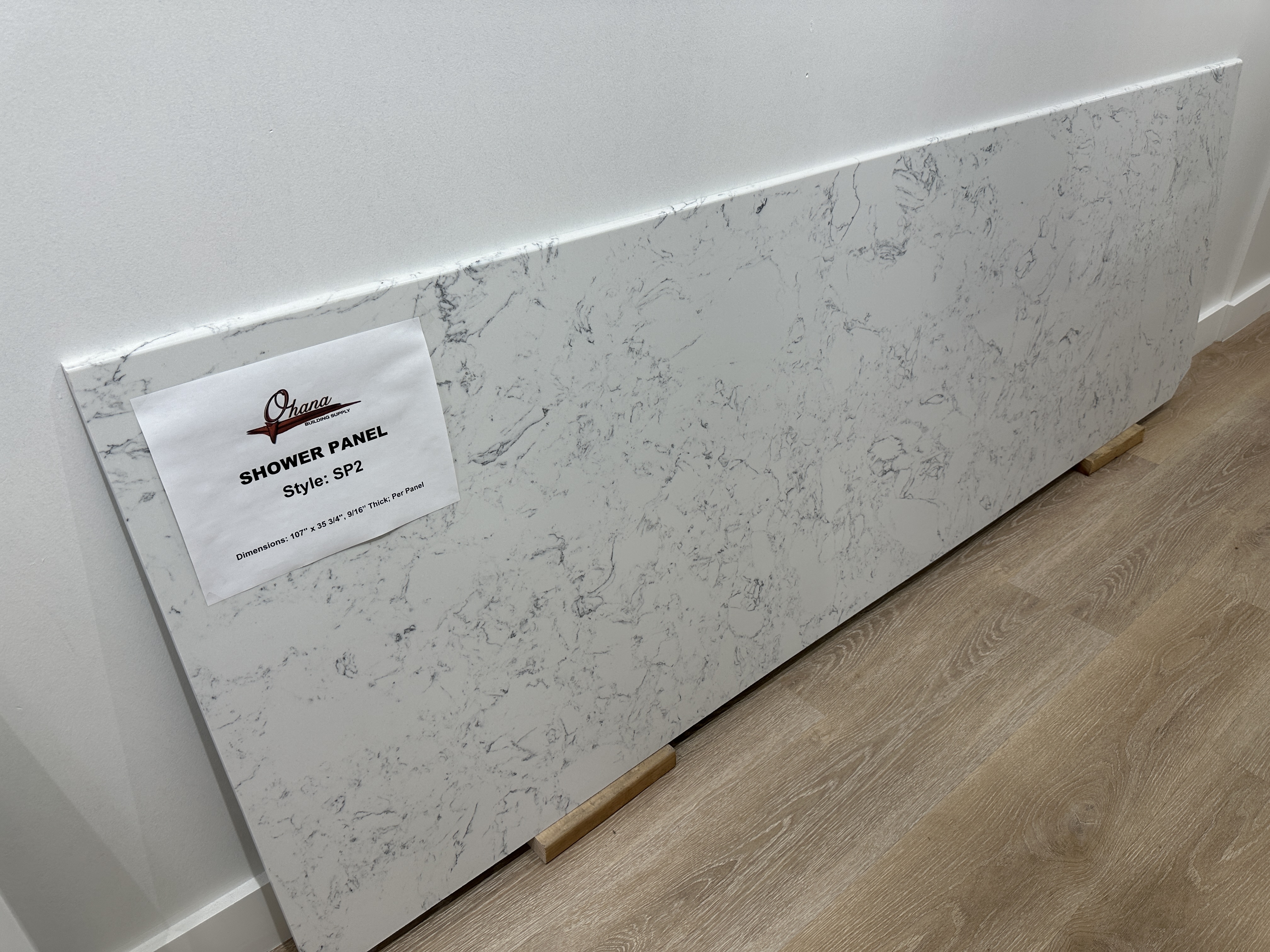 36" W x 107" H Engineered Stone Shower Panel. Durable 5/8" thickness, non-porous and easy to clean surface. Say goodbye to cleaning grout! Available locally now.